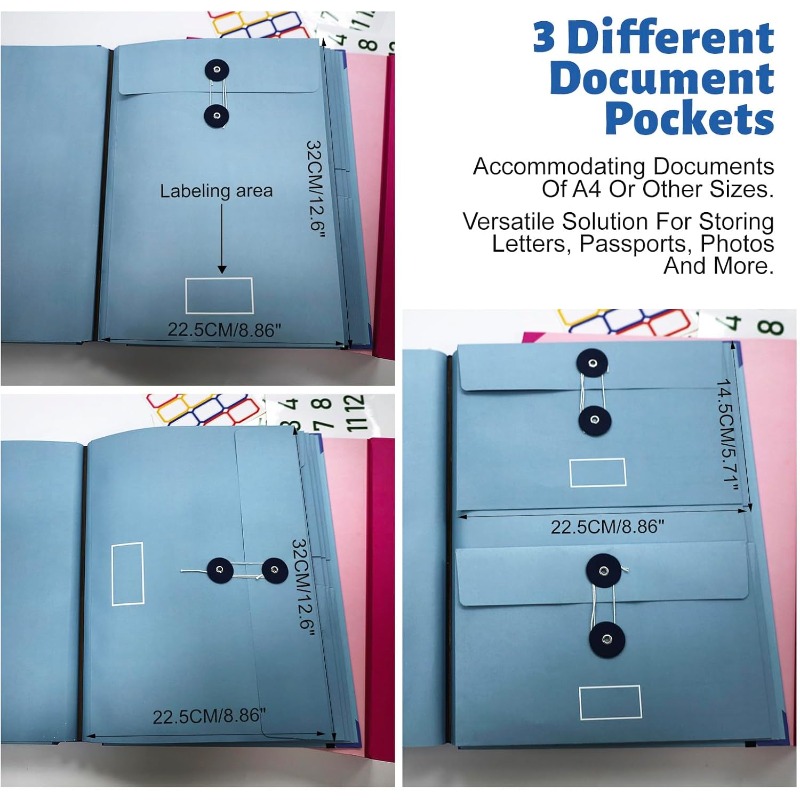 Included hand-illustrated labels and colorful sticker tags show you exactly what to save and where to find it. Use the pre-printed labels for common categories like awards, medical records and tax documents, or write your own on the blank tags. A front pouch provides a landing place for papers before you file them into the correct section.