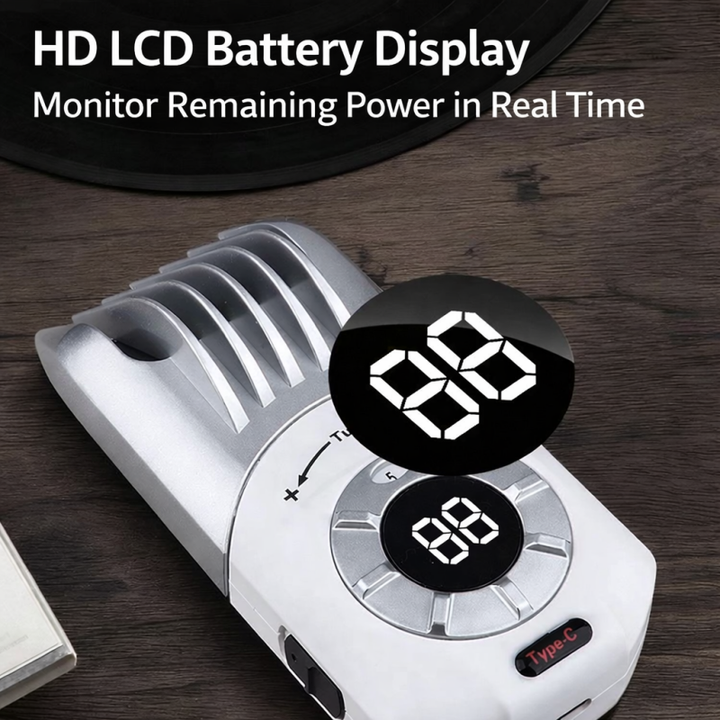 The clear LCD screen shows remaining battery power and current cutting setting—no more guessing mid-cut.