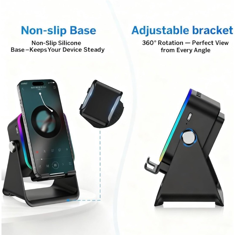 This multifunctional desktop companion combines an induction speaker, Bluetooth speaker, phone/tablet stand, RGB ambient light, and wired audio input in one compact unit. Use it to listen to music, watch movies, join video calls, or play games while keeping your hands free and your screen at the perfect angle.