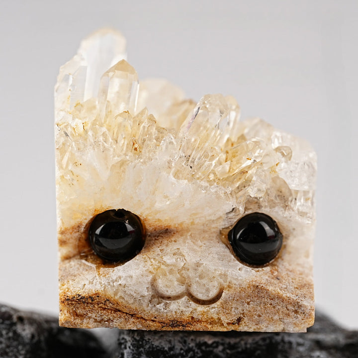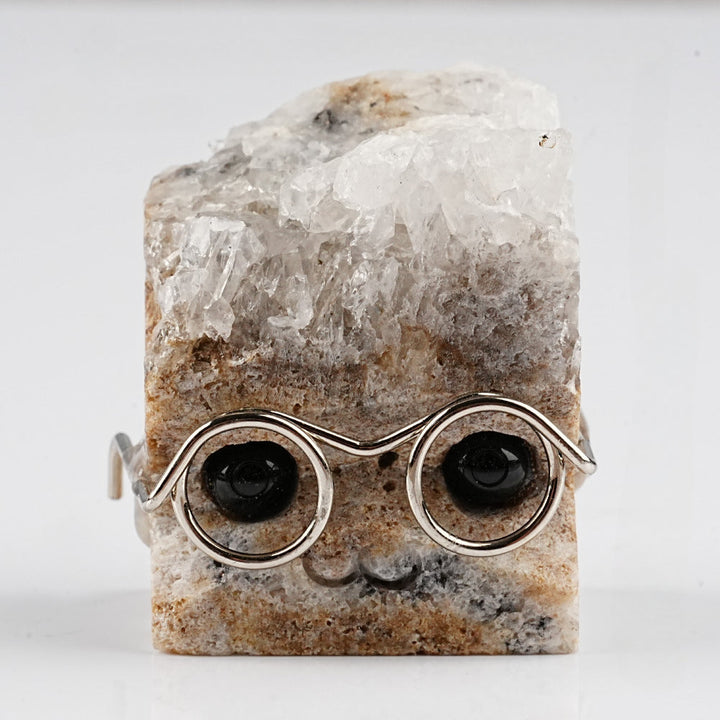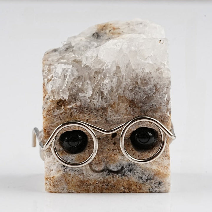 Natural crystal stone with metal and plastic accents (glasses and eyes)