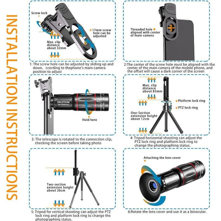 Lightweight and easy to attach with the adjustable phone clamp. Each set includes a telephoto lens (your choice of 18X/28X/36X/64X), fisheye lens, adjustable cat-shaped clamp, soft eye cup, front & rear lens caps, cleaning cloth, and a colorful gift box.
