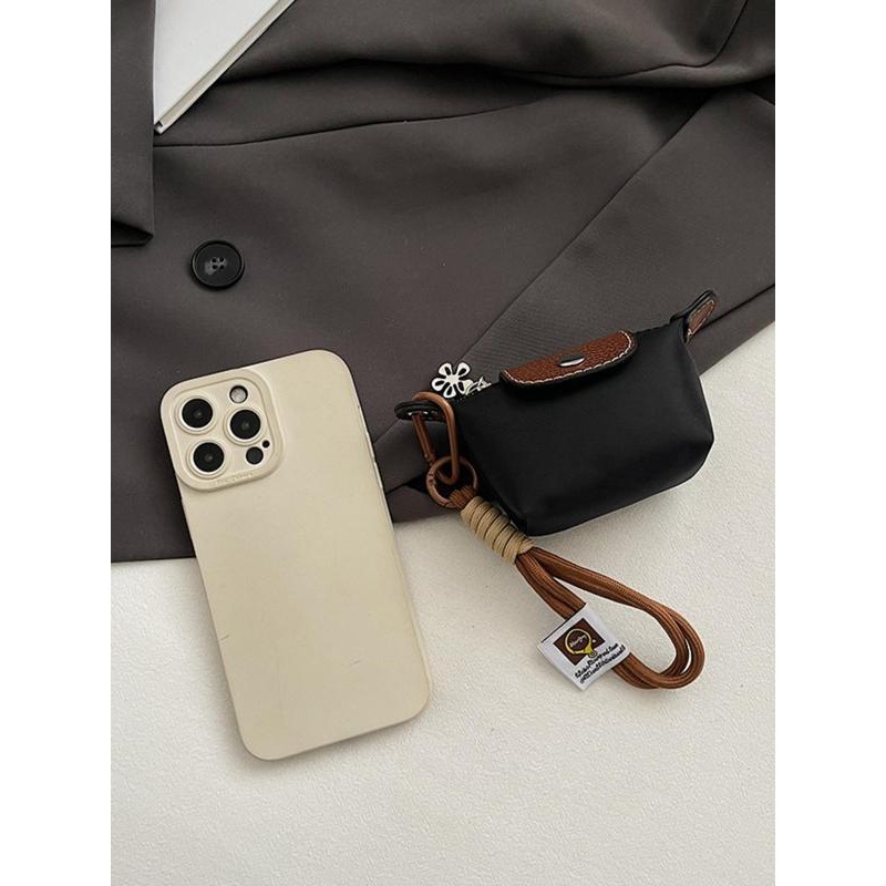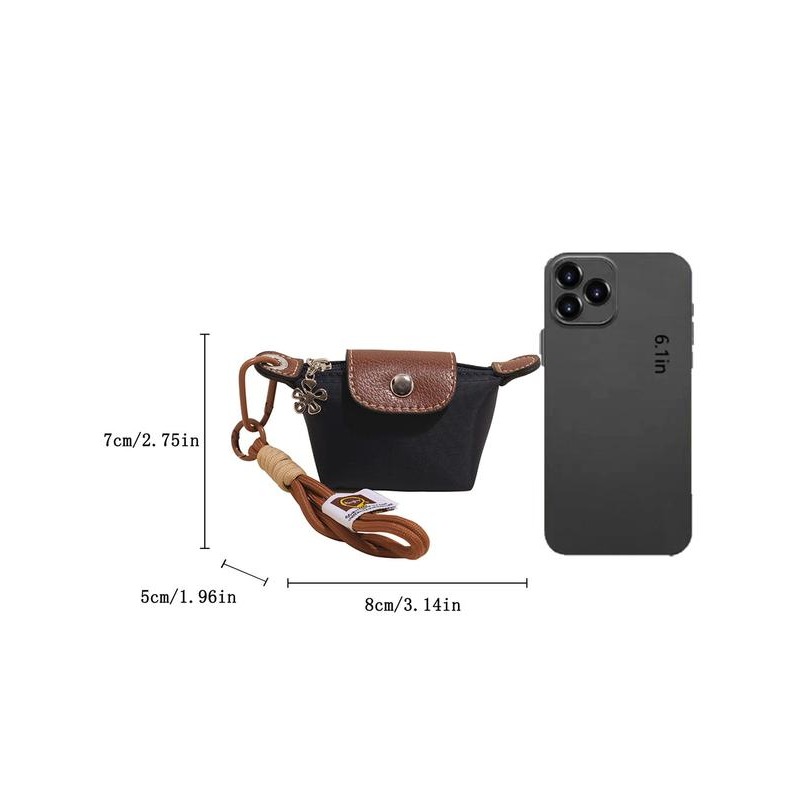 With its mini dumpling silhouette, this wristlet looks just as cute as it is useful. Measuring approximately 8 × 5 × 7 cm / 3.14 × 1.96 × 2.75 in, it fits comfortably in the palm of your hand. The phone comparison image shows how tiny and travel-friendly it is next to a 6.1 in smartphone.