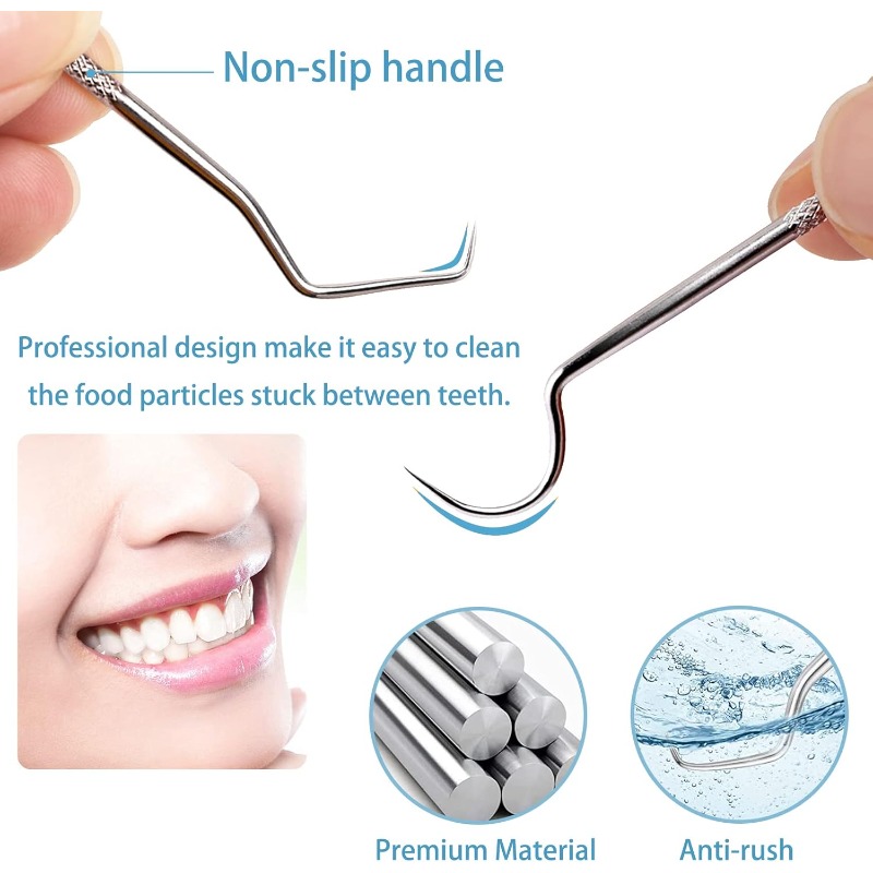 The set includes seven different toothpicks and cleaning hooks, each shaped to reach a specific area of your mouth. From tight gaps between teeth to the back molars and along the gum line, these tools help remove food particles and soft tartar that brushing alone may miss.