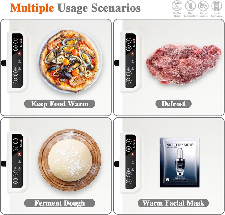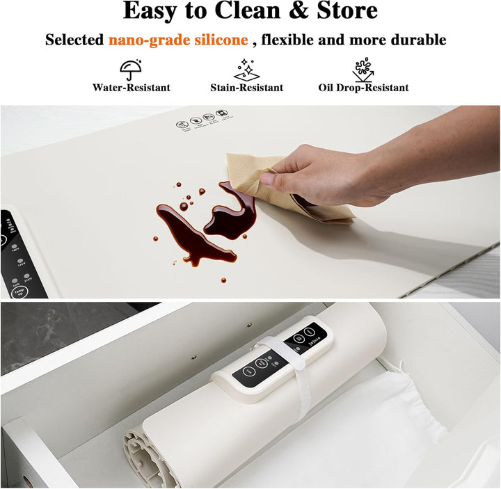 Premium Silicone Nano-Material : Electric warming tray is made of op-tier flexible silicone nano material, offers durability, splash-proof protection, stain resistance, and oil resistance. Fold and store without worrying about unsightly creases, ensuring lasting quality.