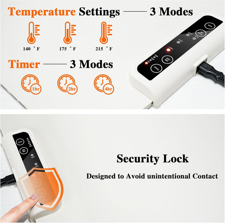 3-Level Temperature & Timer Control : Enjoy the convenience of precise temperature (140 ℉ /175℉ /215 ℉)adjustment for both warming and heating. Our 3-level timer (1hr/ 2hr/4hr ) setting feature ensures your food is kept at the perfect temperature, enhancing your dining experience.