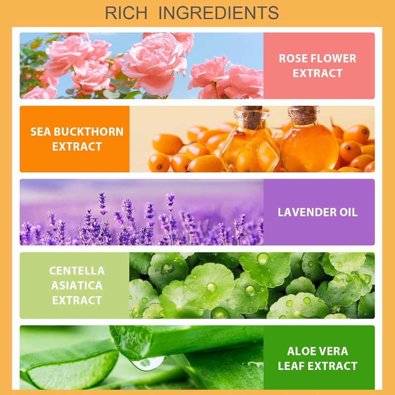 | Key Ingredients | Rose flower extract, sea buckthorn extract, lavender oil, centella asiatica extract, aloe vera leaf extract |